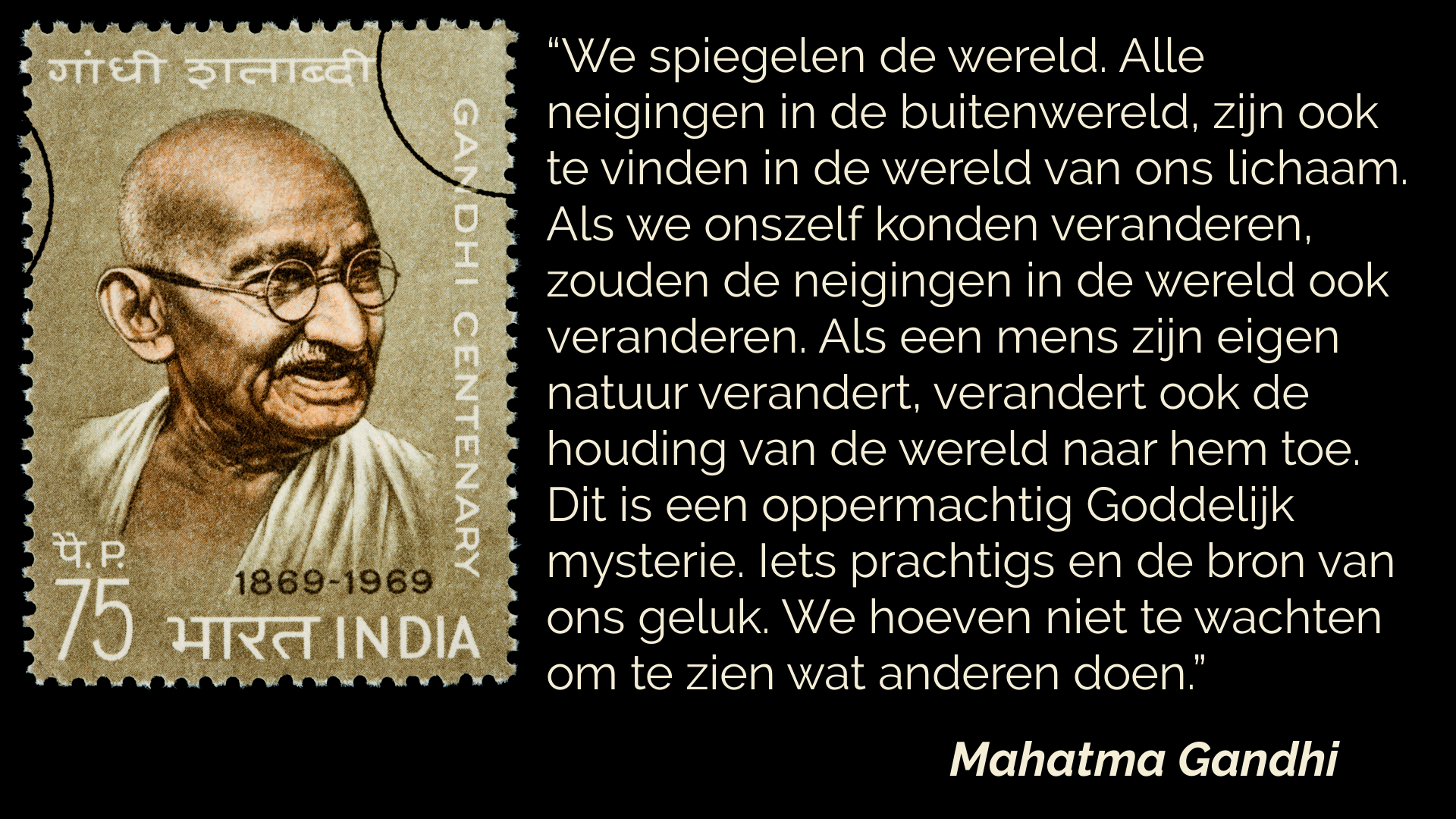 Toch wilde ik ook daar die verandering zijn. Maar HOE dan? Ik besloot de tekst waar het eerste citaat uitkwam op te zoeken. Maar toen bleek Gandhi dat helemaal niet gezegd te hebben! Hiernaast staat wat hij wel zei. Dat leerde me om mijn ervaringen niet meer klakkeloos voor waar aan te nemen. En ook, dat als ik die spiegel ben, ik dus inderdaad iets in mezelf moest veranderen om de verandering te zijn die ik wens te ervaren in de wereld. Naar het HOE heb ik ruim 16 jaar gezocht, waarvan zo’n 10 jaar in samenwerking met mijn vader. Je kunt dus wel zeggen dat het me gelukt is om manieren te vinden om mijn ervaringen te veranderen en bijna overal vanuit liefde te leven.